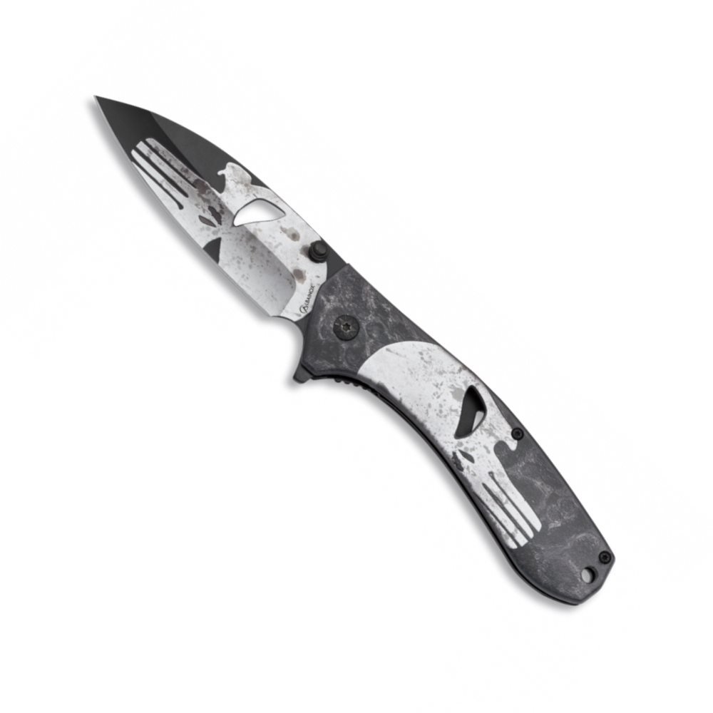 - Unikátní 3D design PUNISHER: Šedočerné pozadí rukojeti zdobí detailně vypracovaný potisk lebky, který dodává noži neotřelý a mužný vzhled.
