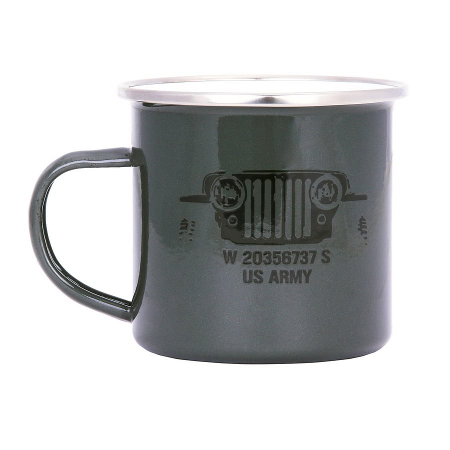 Lehký praktický hrnek s originálním potiskem – maska proslulého vozu Jeep, pod ní nápis W 2035677 W US ARMY. Objem 300 ml, materiál – 100 % smalt. Hmotnost – 130 gramů.