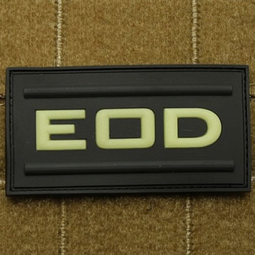 Plastová nášivka s nápisem EOD (Explosive Ordnance Disposal – pyrotechnik). Po nasvícení svítí ve tmě. Rozměr cca 7 x 4,5 cm.