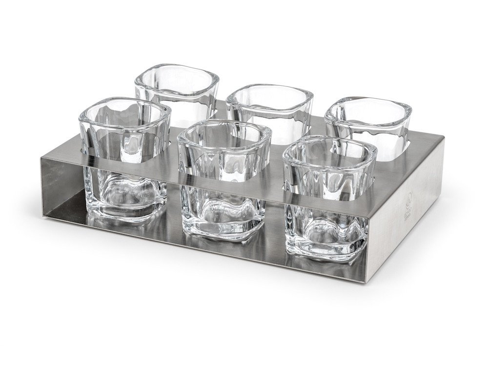 - Elegantní tác z nerezové oceli: Podklad tvoří minimalistický tác z vysoce kvalitní nerezové oceli. Jeho povrch je odolný proti otiskům prstů a poškrábání, a díky vyfrézovaným důlkům sklenice bezpečně drží na svém místě.