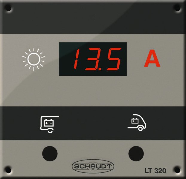 Zobrazení solárního nabíjecího proudu obytného prostoru nebo startovací baterie, LED displej je aktivní pouze při dotazu. Vhodné pro solární regulátory Schaudt LRS1214, LR1218, LRM1218.