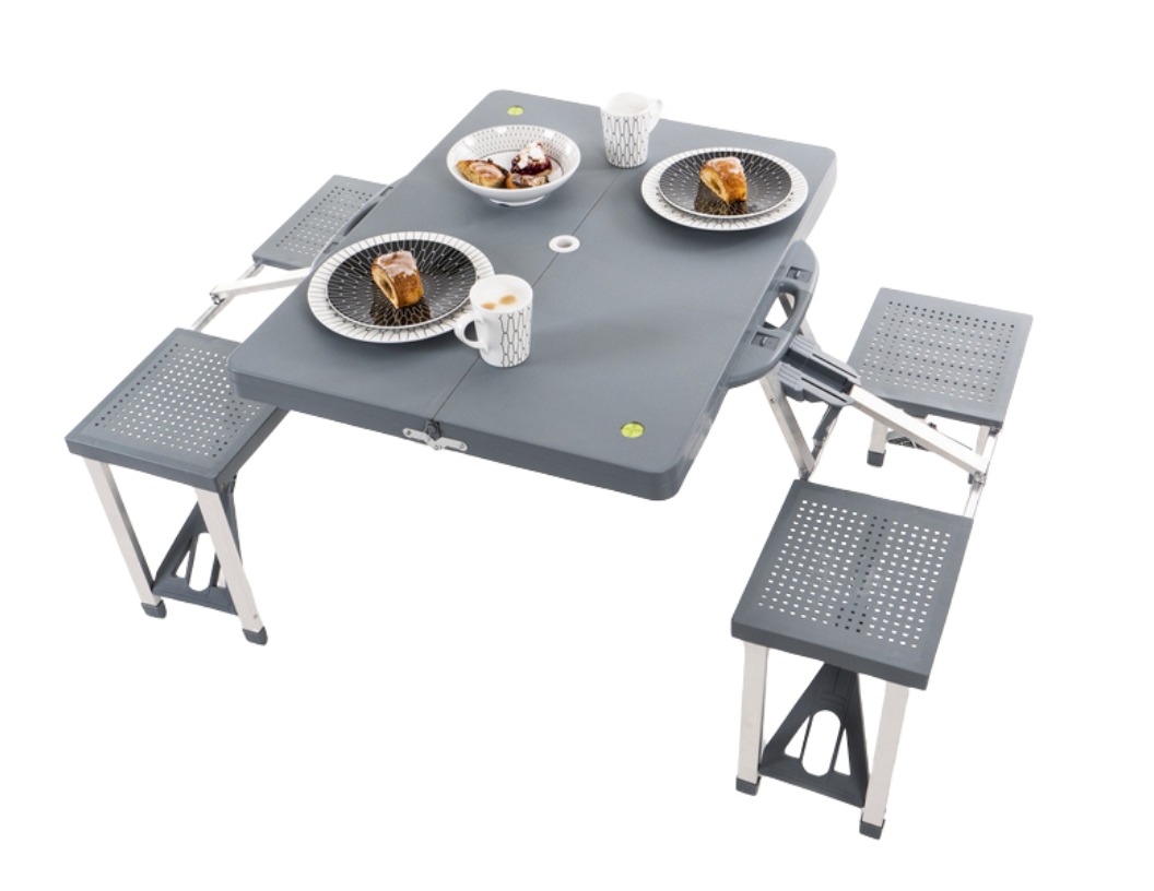 Tento piknikový stůl vyniká především svou praktičností a jednoduchostí použití. Díky důmyslnému skládacímu mechanismu typu kufr jej rozložíte během několika sekund bez nutnosti jakéhokoliv nářadí nebo dodatečné montáže. Stůl disponuje ergonomickou výškou 67 cm, která odpovídá standardu pro pohodlné stravování.