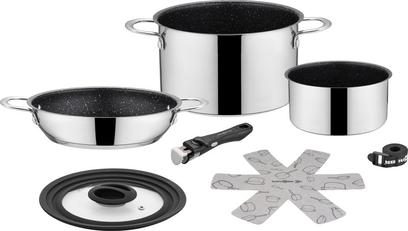 Vysoce kvalitní sada hrnců z nerezové oceli s nepřilnavým povrchem. Prostorově úsporný design. Obzvláště vhodný pro rekreační vozidla a lodě. Velký hrnec a pánev jsou vybaveny robustními rukojeťmi a termoizolačním dnem. Jsou vhodné pro plynové, elektrické, sklokeramické a indukční varné desky. Lze mýt v myčce nádobí. Se systémem Vacublock.