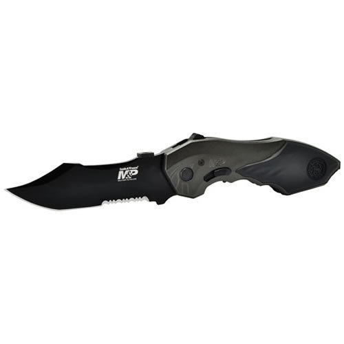 Vyhazovací nůž Smith & Wesson s částečně zubatou nerezovou čepelí s černým povrchem. Hliníková střenka s rozbíječem skla, klipem pro přichycení ke kapse a pojistkou proti náhodnému otevření.