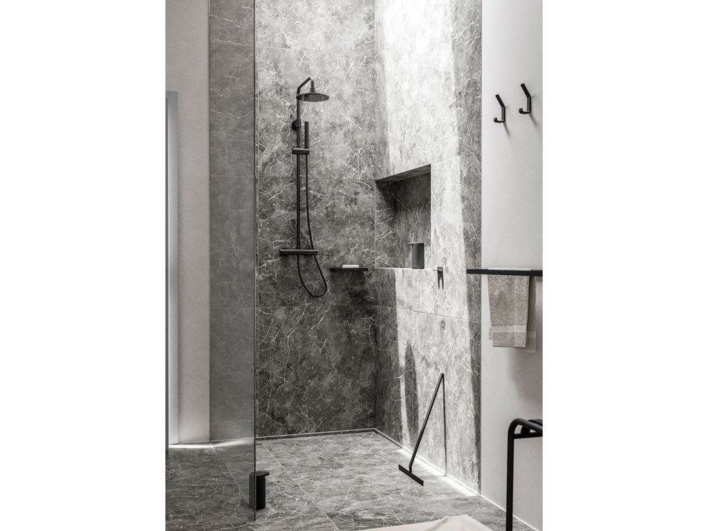 - Univerzální černá barva: Matná černá dokonale ladí s jakýmkoliv barevným schématem – od bílých a dřevěných koupelen po industriální nebo minimalistický styl.