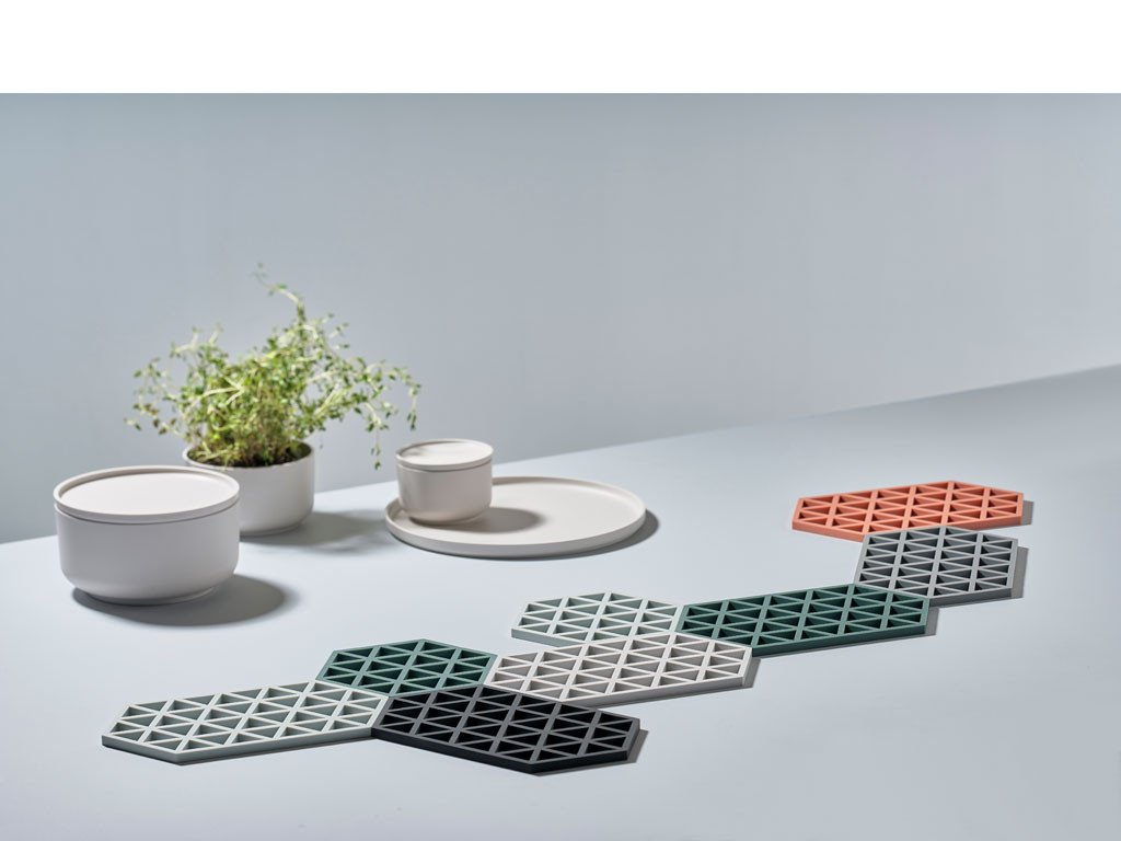 Podložka Zone Denmark Triangles v jemné teplé šedé barvy okamžitě upoutá svým geometrickým vzorem. Nejedná se však pouze o pěkný doplněk. Je vyrobena z prvotřídního potravinářského silikonu, který bez problému snese teploty přesahující 200° C. Můžete na ni tedy bez obav postavit rozpálený hrnec, pekáč z trouby, kávovar nebo žehličku. Váš nábytek zůstane dokonale chráněn před nežádoucími horkými skvrnami a poškrábáním.